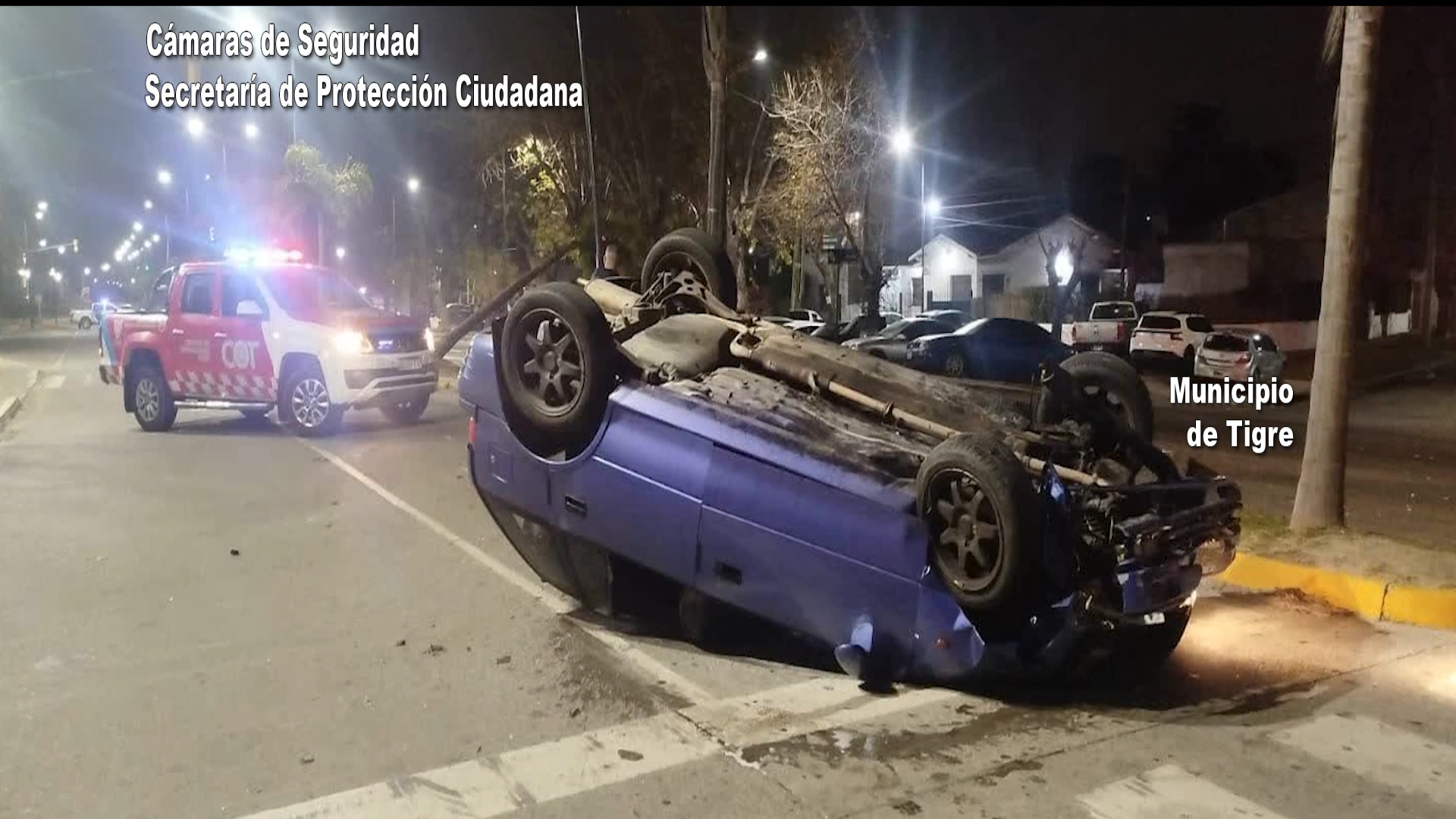 Las cámaras de seguridad del Centro de Operaciones Tigre (COT) detectaron un impactante siniestro vial en la localidad de Troncos del Talar. Un auto colisionó contra una palmera y volcó. La víctima -fuera de peligro- fue trasladada al hospital para una mayor atención.