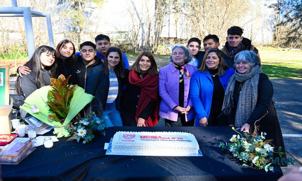 En Villa La Ñata, el intendente de Tigre, Julio Zamora, y la secretaria de Desarrollo Social y Políticas de Inclusión, Gisela Zamora, acompañaron el acto de imposición del nombre “Margarita Graciela Perrone” a la Escuela Secundaria N°30, en reconocimiento a la trayectoria de quien fue docente y directora de la institución, así como una vecina comprometida con la comunidad educativa local.