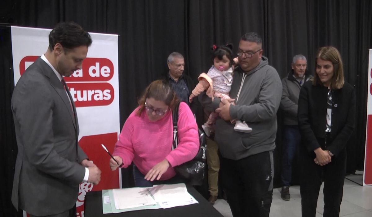 Vecinos y vecinas formalizaron la documentación de regularización dominial que garantiza la propiedad de su vivienda. El acto se ejecutó en el marco de la Operatoria Procrear bajo la Ley 10.830